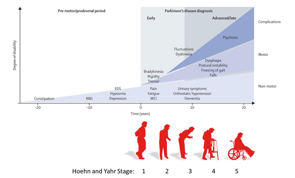 At the earlier end of the spectrum, prior even to Stage 1, there often are symptoms that precede the diagnosis, such as constipation, sleep disturbance, loss of sense of smell and low mood (see top figure).